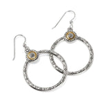 Forward-facing large 1 1/4” hoops feature a small round pendant with a gold inlay. The hoop itself is decorated with etched details and raised granulations. Fun, lightweight and swingy!
