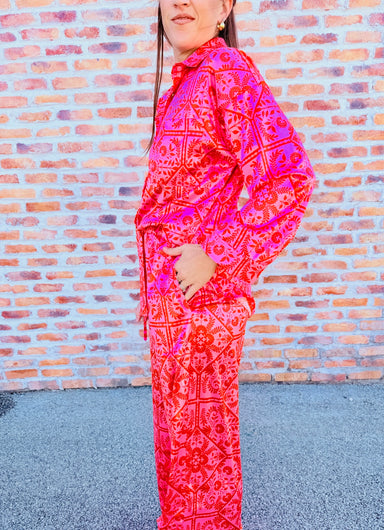 More Options Available$42.00| /Rock a retro vibe with this charming floral button-up top that brings vintage flair to your everyday wardrobe. The playful bright pink hue pairs be...