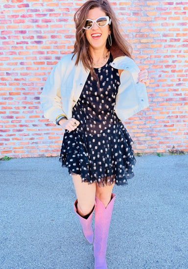 Meet the Tinsel Kiss Mini Dress — a mini dress with puffed bottom and square neckline, perfect for holiday nights! Lynette is wearing a size small...
