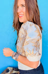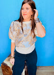 Turn heads in this playful metallic puff sleeve knit top! With a shimmery front print, an elastic waistband, and adorable puff sleeves, it’s perfect for adding a little flair. Pair it with jeans and heels for an effortlessly charming look at any occasion!