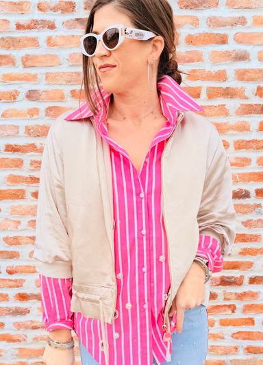 Elevate your wardrobe with this chic Joesph Ribkoff zip-up jacket in a gorgeous moonstone hue. The three-quarter sleeves and adjustable waist draws...