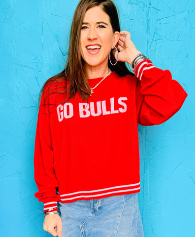 Cheer on the Bulls in style with this spirited raglan sweater—your perfect game day top!! Lynette is wearing a size medium