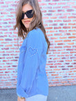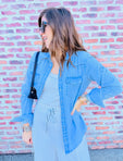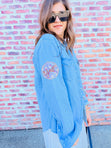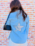 Get ready to shine at your next rodeo with this timeless chambray shirt! Featuring pearl snap buttons, sparkling rhinestone details along the collar, and a standout rhinestone star on the back, it’s the perfect playful pick for any western adventure.
