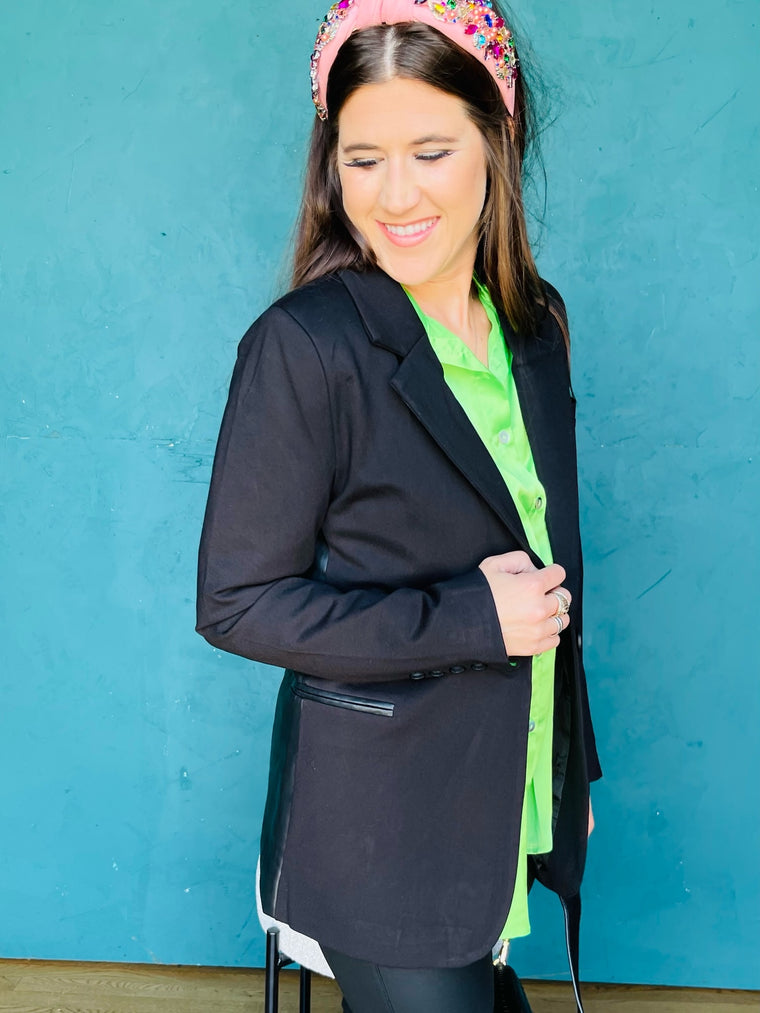 Shaunee vegan leather front top with a sleek silhouette designed for modern elegance. This versatile piece features an eye-catching asymmetrical cu...