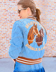 This chambray bomber jacket is a delightful mashup of style influences. Inspired by English riding wear, it features askew quilt stitching and faux leather flap pockets that nod to equestrian tradition. Racing stripes trim the cuffs, collar, and waistband for a retro racing vibe, while the back showcases embroidered horsehead designs and Western-inspired wording that channels classic rodeo aesthetics. It's the jacket that has blends of preppy, vintage, and Wild West all rolled into one.