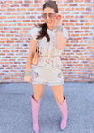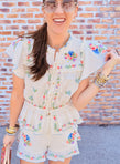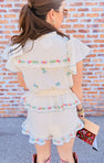 Sweet, romantic, and full of detail! The Romey Top stuns with flutter sleeves, dainty front ties, and a flattering drawstring waist for the perfect mix of femme and relaxed. Finished with decorative floral embroidered trims, it’s made to match with the Cannes Shorts for the cutest spring set!