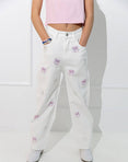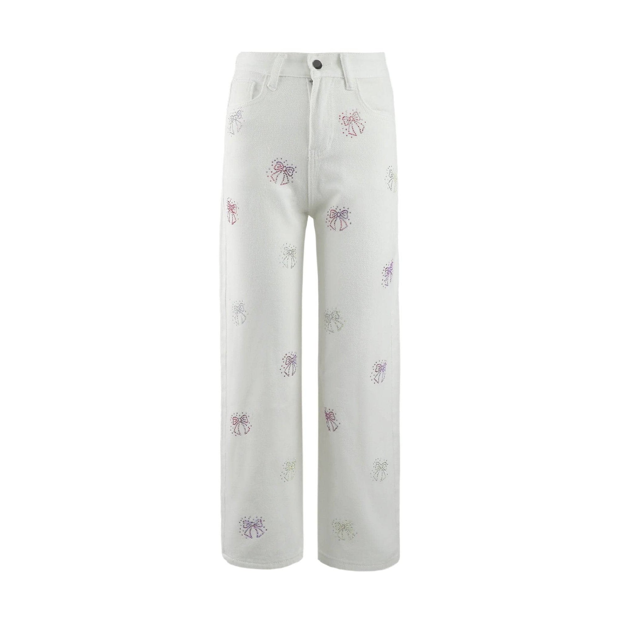 Embrace a splash of color with the jeans, featuring charming rainbow-colored crystal bow accents scattered across the fabric. Designed with a relaxed fit and straight-leg cut for effortless style and comfort.