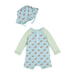 Get ready to quack up with this 2-piece set! You'll love the playful design of the nylon spandex rash guard, featuring raglan seersucker long sleeves and chest placket snaps. And don't forget about the inner leg snaps for easy diaper changes. It also comes with a coordinating bucket hat with a handy chin strap. Stay stylish and comfortable with this duck-tastic set!