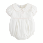 This charming embroidered poplin bubble is a delightful addition to any little one's wardrobe. Crafted with meticulous attention to detail, it features a classic Peter Pan collar that adds a touch of timeless elegance. The contrast piping enhances the overall design, providing a subtle yet stylish accent. Designed for both comfort and convenience, this bubble includes inner leg snaps, making diaper changes a breeze.