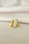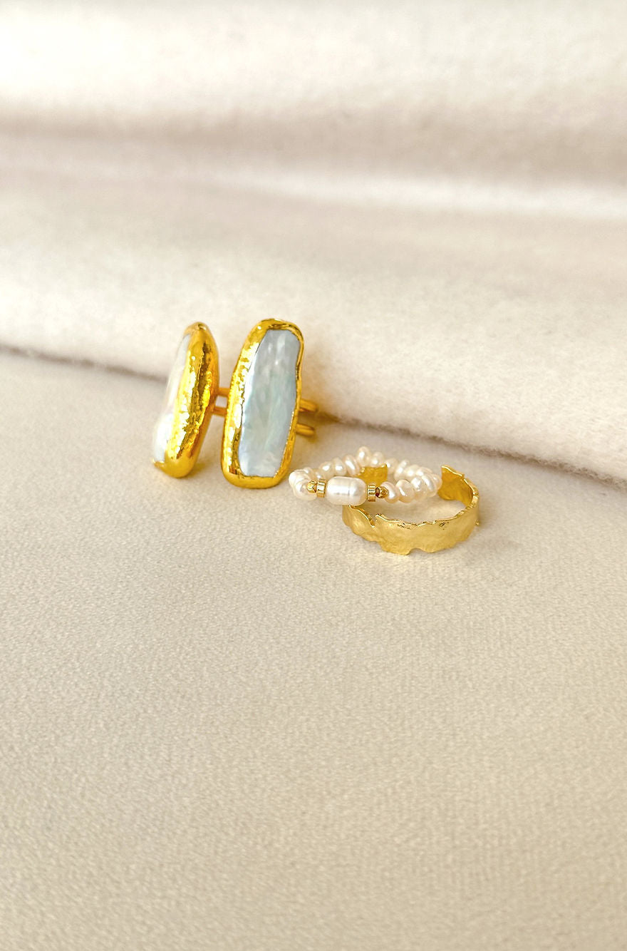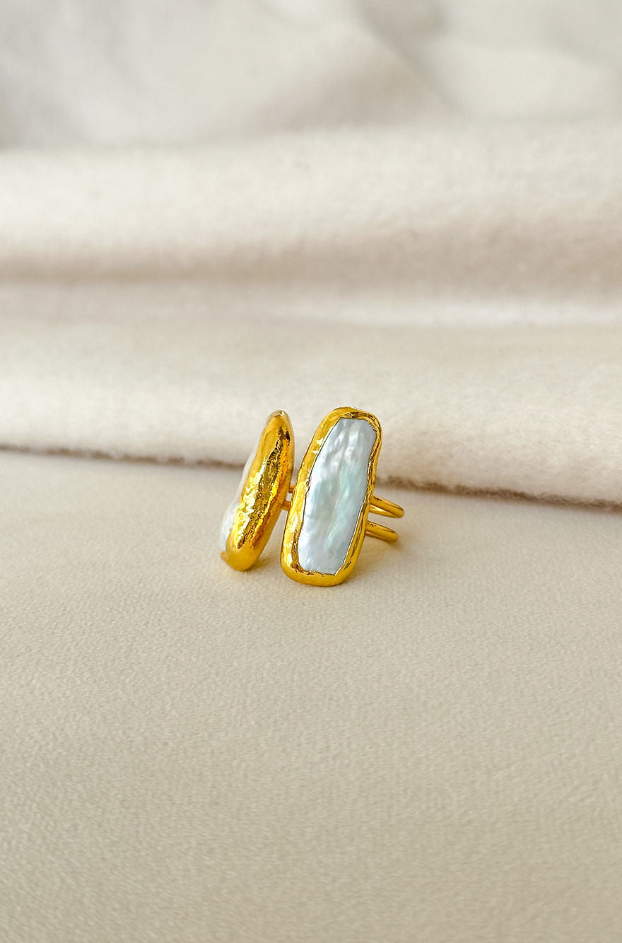 The Double-Decker Pearl ring - a mesmerizing accessory that's bound to turn heads. This wraparound ring boasts not just one, but two freshwater pearls, making it one-of-a-kind. The pearls are nestled in 18k gold coating, elevating the opulence of this exquisite creation.