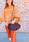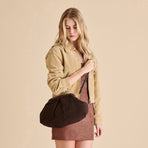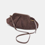 SAHARA is the ultimate fall clutch for every event on your calendar. Luxe suede in cognac or espresso, a slightly pleated design, and a frame closure complete this spacious bag. Utilize the detachable crossbody strap for a hands-free option and head out to the party.
